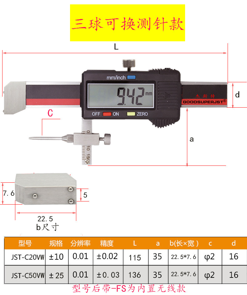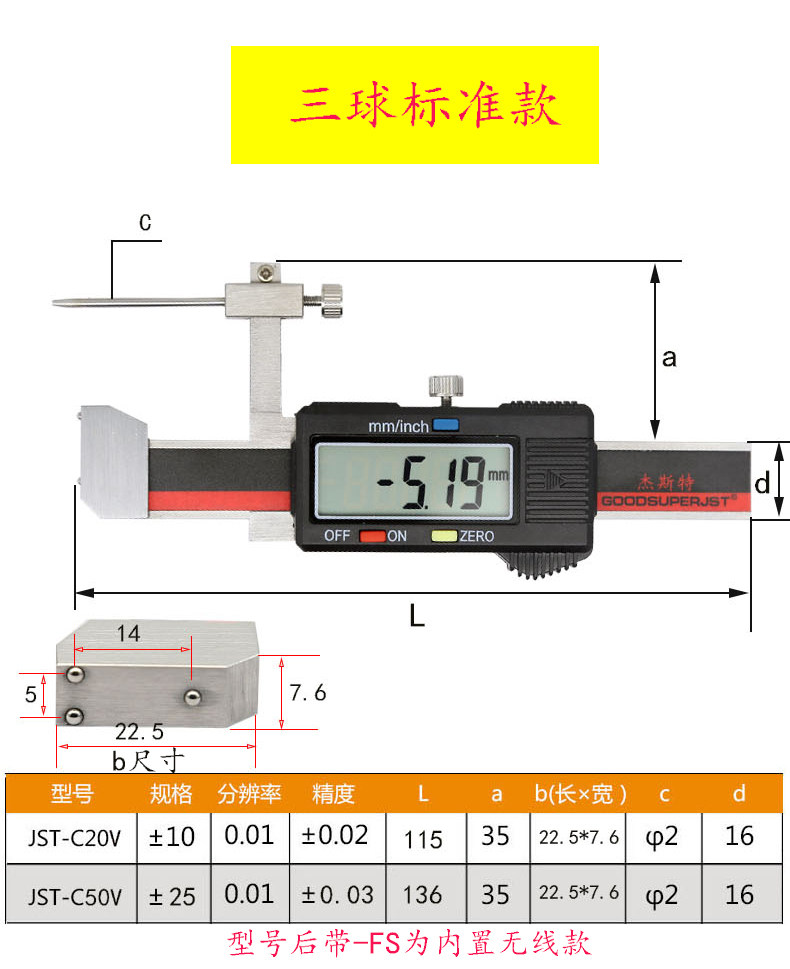 三球数显面差尺三点电子高低尺JST-C20V/C50V